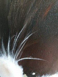 L’étape 8 me demandera certainement du courage puisqu’il s’agira de vous expliquer comment peindre les yeux. J’aurai en tête ses regards qui me suivaient partout, toujours en alerte, toujours vers moi ou vers les oiseaux qui traversaient le ciel de la terrasse, comme des provocations libres qui l’auraient nargué.